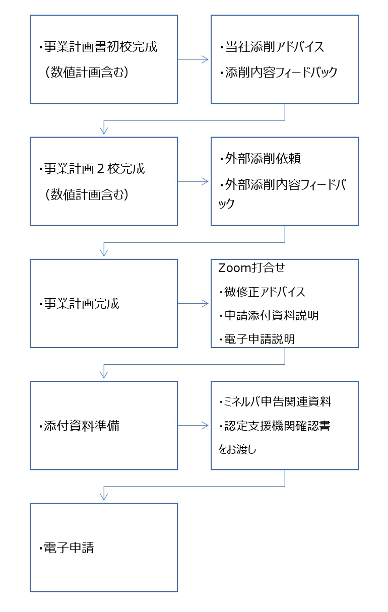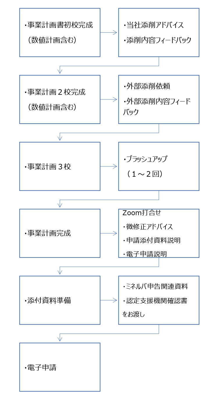 お申込から補助金の電子申請まで標準的に要する期間はおおよそ6週間程度かかります。また、外部添削には締め切りがあり、間に合わない場合がありますので、ご注意ください。